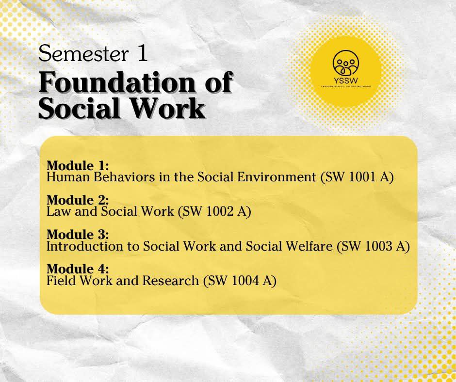 ကျွန်မတိုရဲ့ Diploma in Social Work မှာ Social Work ရဲ့ အကြောင်းအရာတွေ၊ လူတွေရဲ့ အမူအကျင့်တွေ၊ ပြည်သူလူထုတစ်ဦးတစ်ယောက်ချင်းစီကို ချဉ်းကပ်ပုံတွေ၊ ဥပဒေရေးရာမူဝါဒတွေ နဲ့